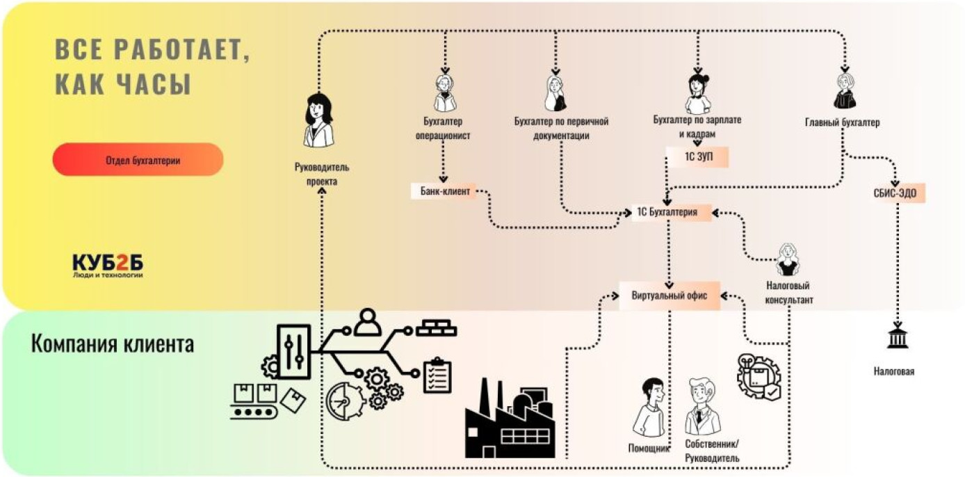 Если штатный бухгалтер перегружен, часто меняется или вовсе отсутствует, команда КУБ2Б готова быстро войти в курс дела и организовать учет с нуля.